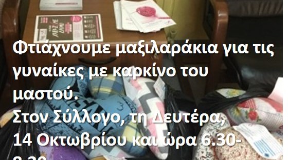 Τα πρώτα περίπου 160 μαξιλαράκια που φτιάξαμε μέχρι σήμερα για γυναίκες με καρκίνο του μαστού παραδόθηκαν στους παρακάτω φορείς: Αντικαρκινικό Άγιος ΣάββαςΠνοή Αγάπης (Σύλλογος που εποπτεύει τους Ξενώνες του Αγίου Σάββα και άλλων νοσοκομείων)Αντικαρκινικό Πειραιά (Ι.Μεταξά)Γενικό Κρατικό ΝίκαιαςΙασώ ΑθήναςΆλμα Ζωής (ο μεγαλύτερος Σύλλογος γυναικών με καρκίνο του μαστού που εφοδιάζει 6 μεγάλα νοσοκομεία). Τα μαξιλαράκια … Συνεχίστε την ανάγνωση Φτιάχνουμε μαξιλαράκια – καρδούλες