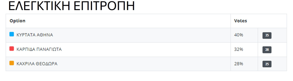Για την Ελεγκτική Επιτροπή εκλέχθηκαν οι Αθηνά Κυρτάτα και Πανίνα Καρπίδα και αναπληρωματικό μέλος η Δώρα Καχρίλα.