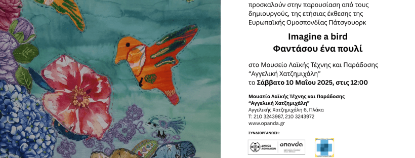 Καλησπέρα σας Εύχομαι όλοι να είστε καλά! Έχουμε την χαρά και την τιμή να σας προσκαλέσουμε στην εκδήλωση της έκθεσης "Imagine a bird / Φαντάσου ένα πουλί" που θα πραγματοποιηθεί το ερχόμενο Σάββατο, 10 Μαΐου και ώρα 12:00, στο Μουσείο Λαϊκής Τέχνης και Παράδοσης «Αγγελική Χατζημιχάλη» Δήμου Αθηναίων. Την έκθεση συνδιοργανώνουν ο Οργανισμός Πολιτισμού, Αθλητισμού … Συνεχίστε την ανάγνωση Παρουσίαση της έκθεσης «Imagine a bird / Φαντάσου ένα πουλί» στην Αθήνα